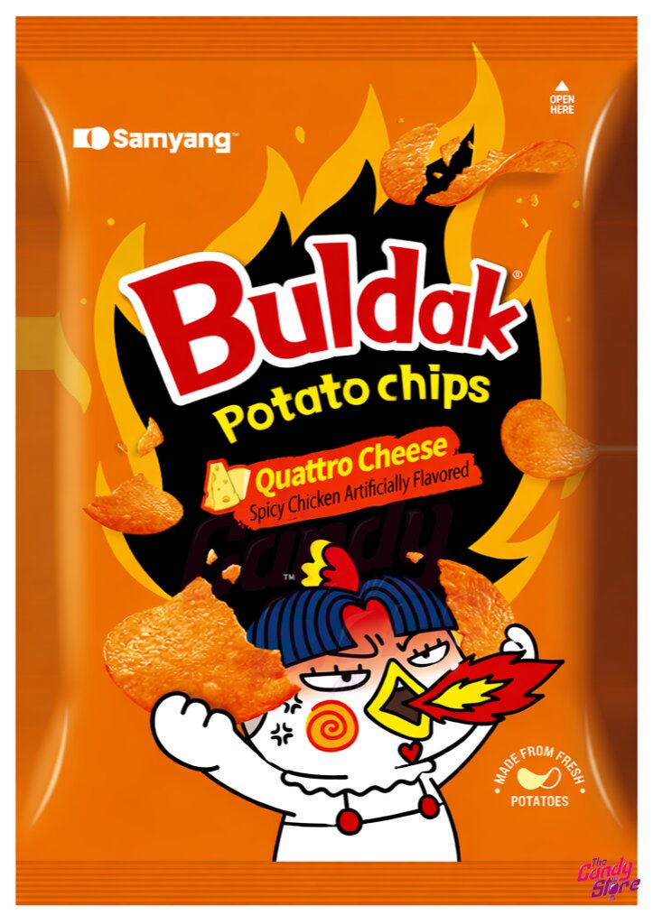 Potatoes, palm oil, Buldak Quattro cheese seasoning: sugar, salt, corn syrup, modified mozzarella cheese: mozzarella, cream, lactose, skimmed milk powder, enzyme modified cheese, colour: paprika extract; dextrin, cheese yoghurt powder: cheese powder, yoghurt powder, flavour enhancer: L-glutamate sodium; acidity regulators: citric acid, malic acid; sweetener: steviol glycosides; onion flavour, skimmed milk powder, flavour enhancer: L-glutamate sodium; anti-caking agent: silica; cheddar cheese : milk, cheese culture, salt, enzymes; gouda cheese : milk, cheese culture, salt, enzymes; chilli powder, whey powder: milk; artificial cheese flavouring, milk powder, onion powder, soya powder , lactose: milk; sodium caseinate , colour: paprika extract; yeast extract; sunflower oil, spices, garlic powder, cream: Milk; maltodextrin, tomato paste, paprika, stabilizer: sodium phosphate; black pepper, acidity regulator: lactic acid; artificial flavors, corn gluten, whole milk powder, flavor enhancers: sodium inosinate, sodium guanylate; Camembert cheese : milk, cream, salt, enzymes; habanero peppers.